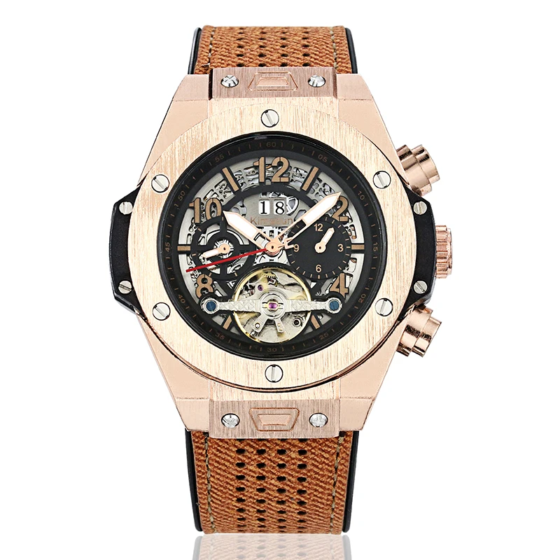 90% OFF Automatic Self Wind Mechanical Rose Gold Silver Black Case Brown Leather Rubber Strap Casual Sports