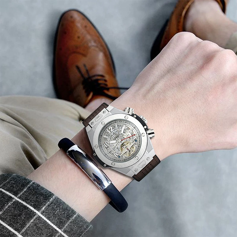 Related Products Automatic Self Wind Mechanical Rose Gold Silver Black Case Brown Leather Rubber Strap Casual Sports
